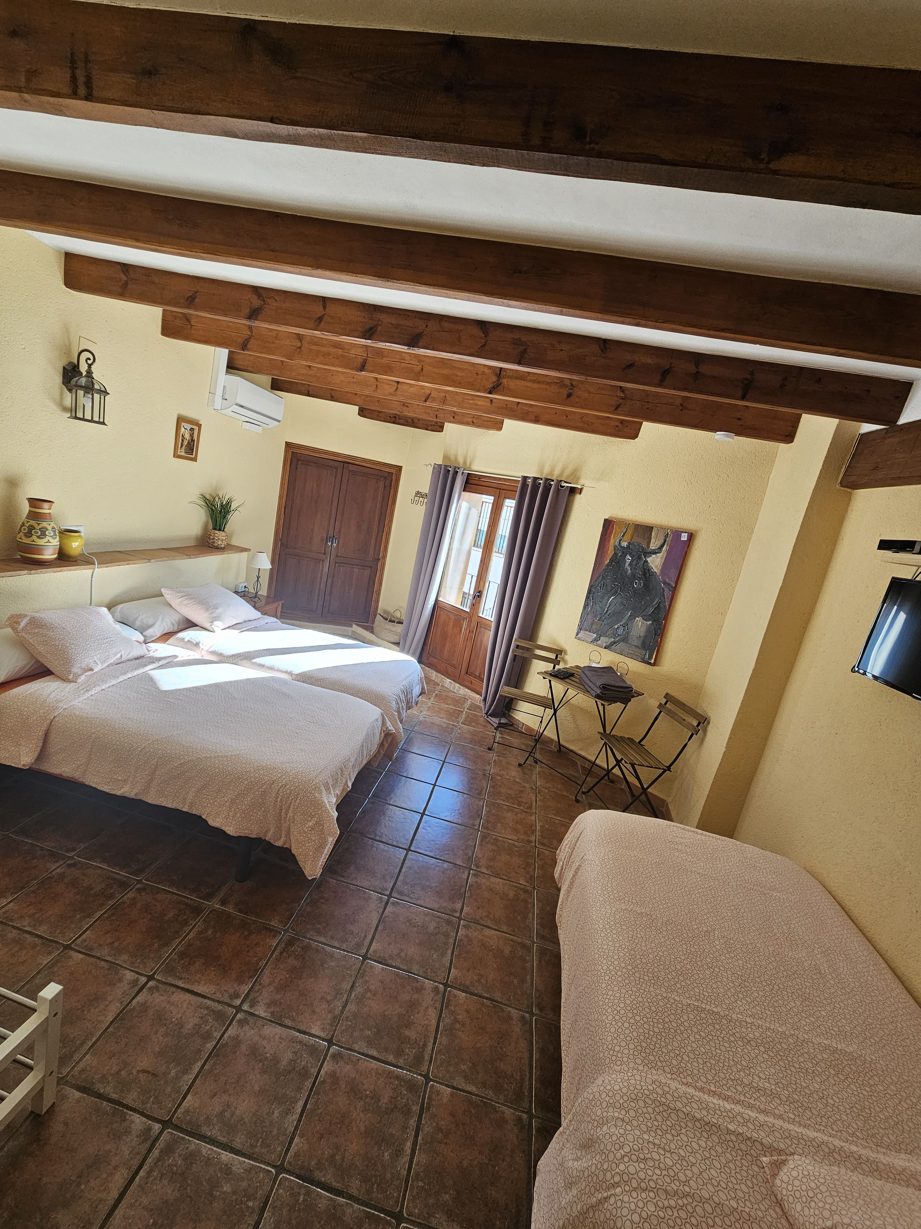 Stap binnen in Kamer Hannes, een gezellige driespersoonskamer in onze prachtige Spaanse villa. Deze kamer is ideaal voor vrienden of kleine gezinnen en beschikt over drie comfortabele eenpersoonsbedden. De ruime badkamer is uitgerust met een inloopdouche, wastafel en wc, wat zorgt voor het nodige comfort tijdens uw verblijf.
